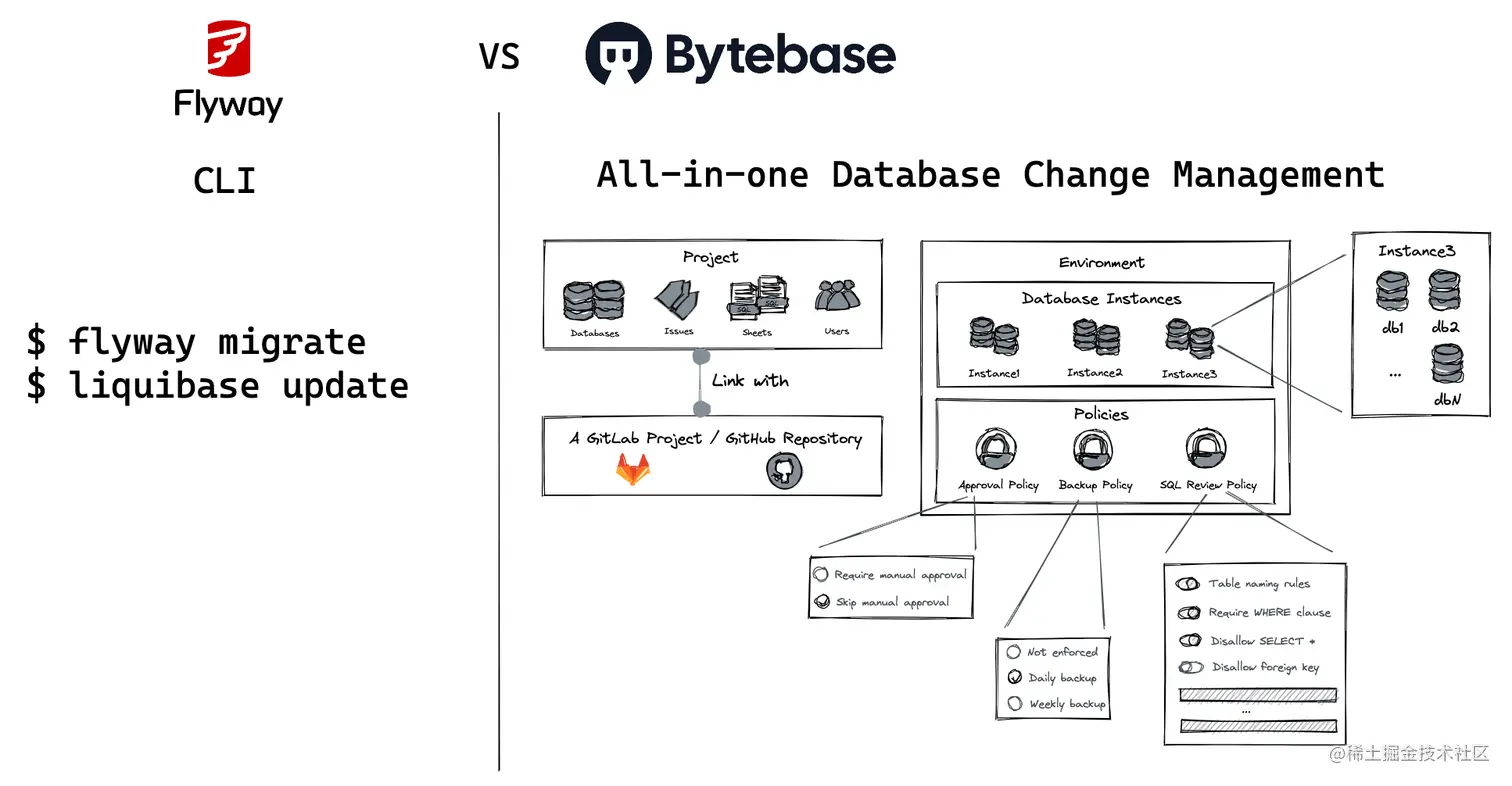 Bytebase 和 Flyway 都能为开发人员提供数据库版本控制和变更的能力,但两者在产品定位,产品形态,具体功能和使用方法上等方面都有较大的差异的。本文将对这两个工具进行多个维度的对比。