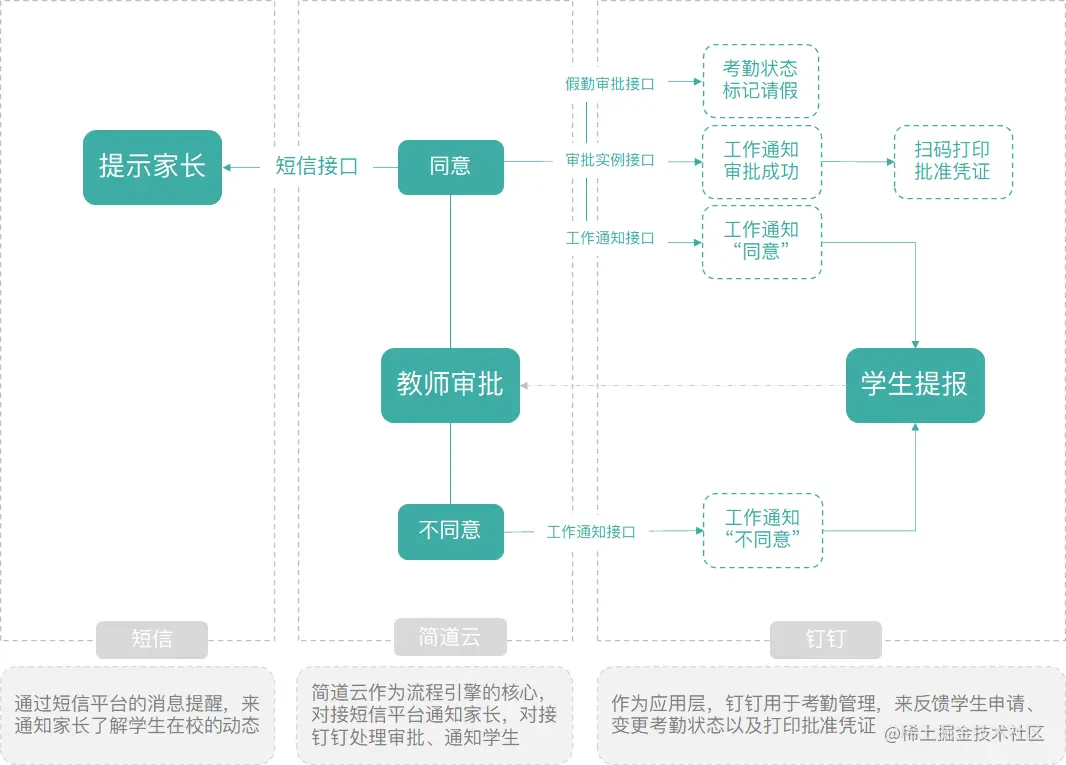 厚一学堂为了满足“既想使用简道云仪表盘,又想使用钉钉考勤”的管理需求,将简道云与钉钉的考勤状态、工作通知、审批结果(扫码自助打印)功能进行打通,实现了对外可通过短信提醒让家长了解学生在校动态。