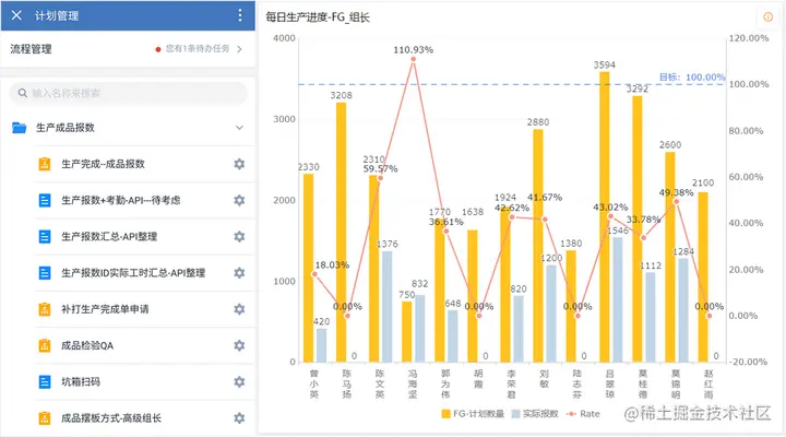 既可以利用仪表盘汇总每日班组报工状况,进行每日生产进度监督;也可以结合班组人员考勤工时,利用数据工厂进行数据组合,自动计算每日班组/部门生产效率。