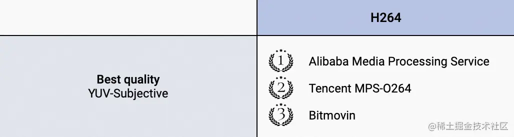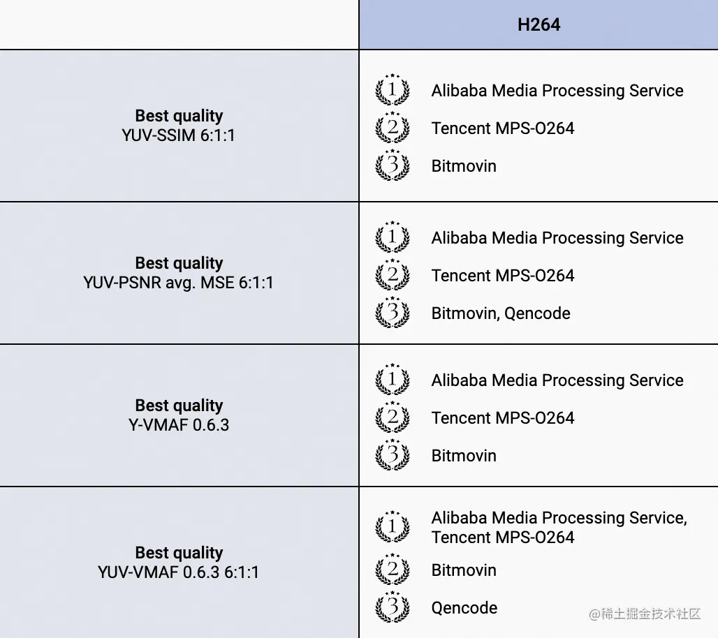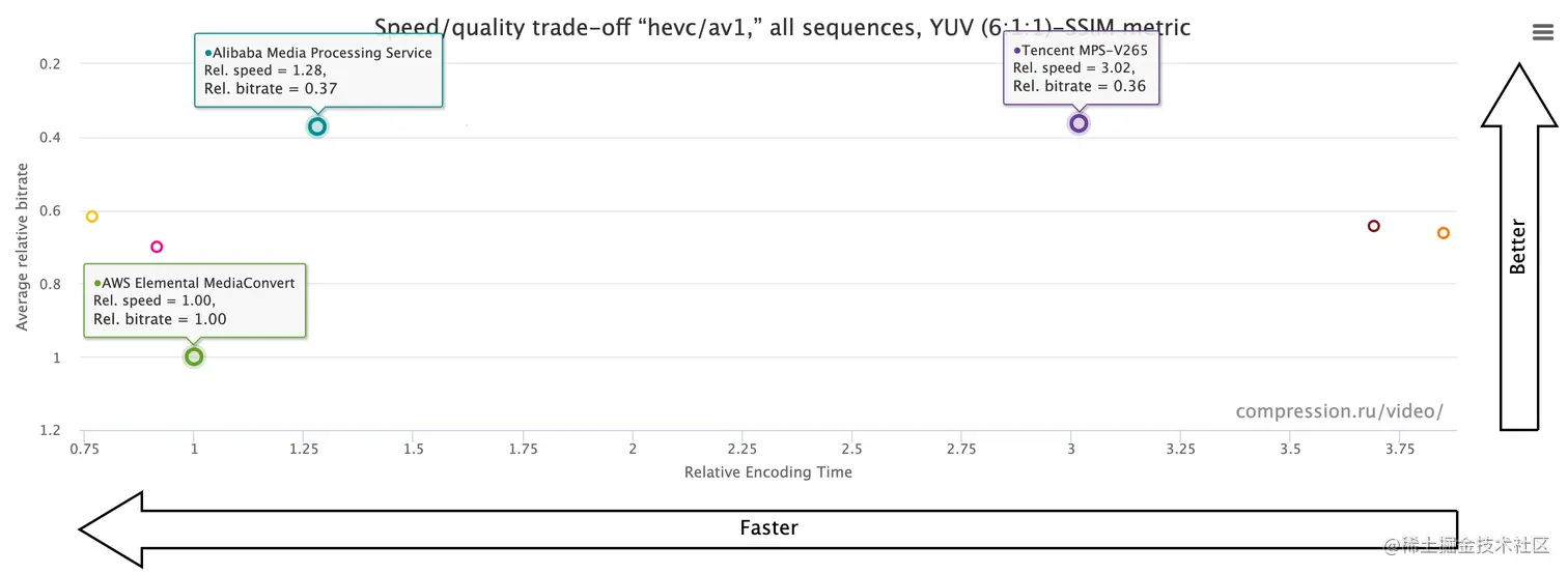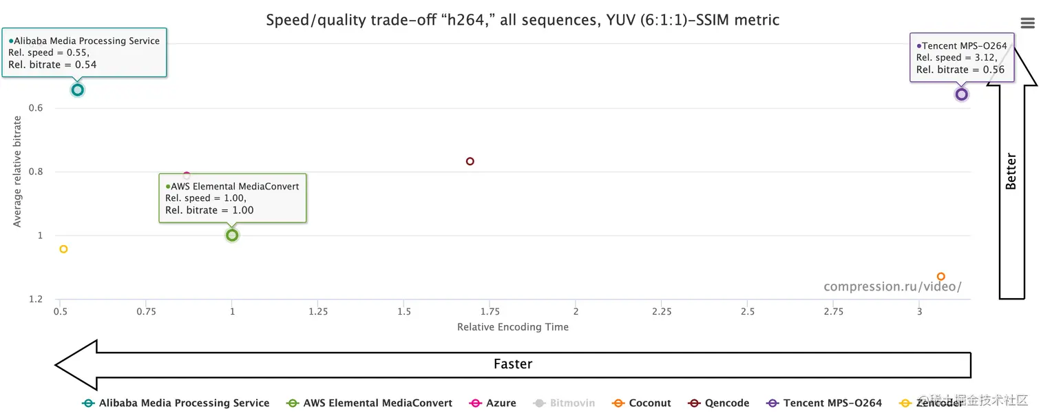 正如横(Faster)纵(Better)箭头所指,越靠近图片左上角则表示:在相同质量下,该编码器的码率越低,转码速度越快。 可见,除了前文提到的主客观画质卓越,阿里MPS s264在编码器性能及商用价值维度更加处于领先之势。