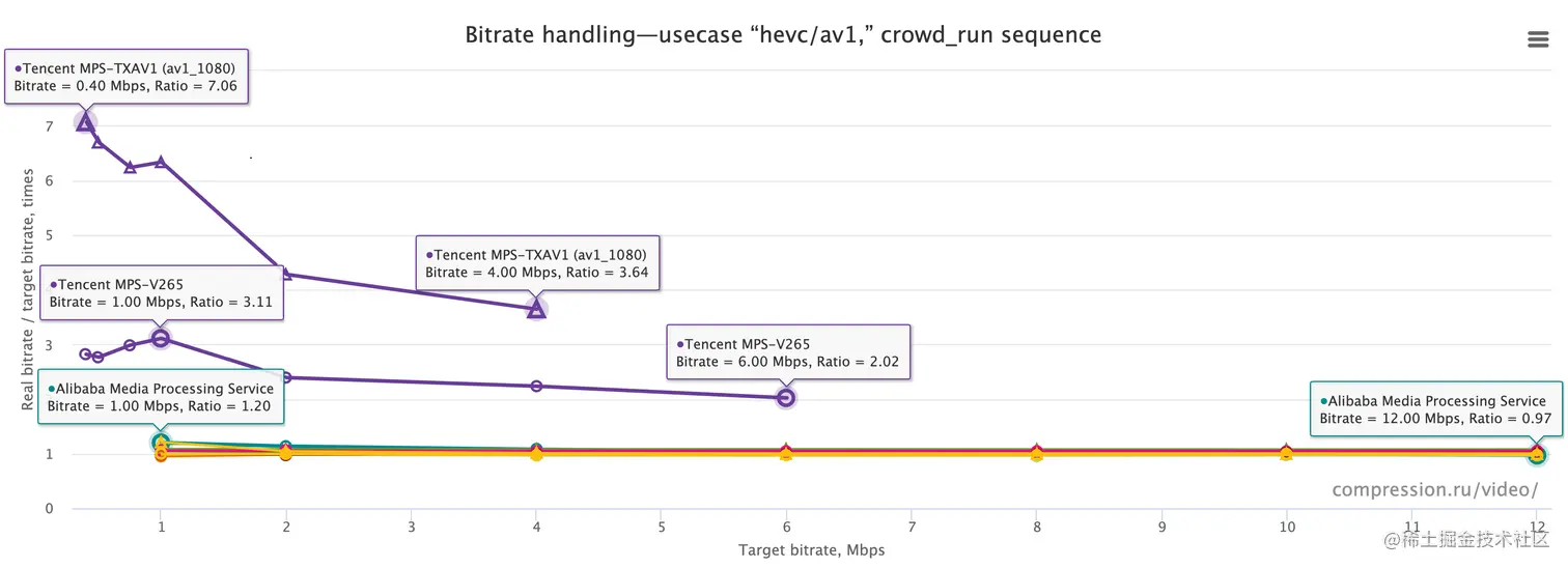 针对码率控制,下图则表示HEVC/AV1赛道的实际输出码率与预设目标码率的比例,无限接近1表示该编码器码率控制的精准度越高。