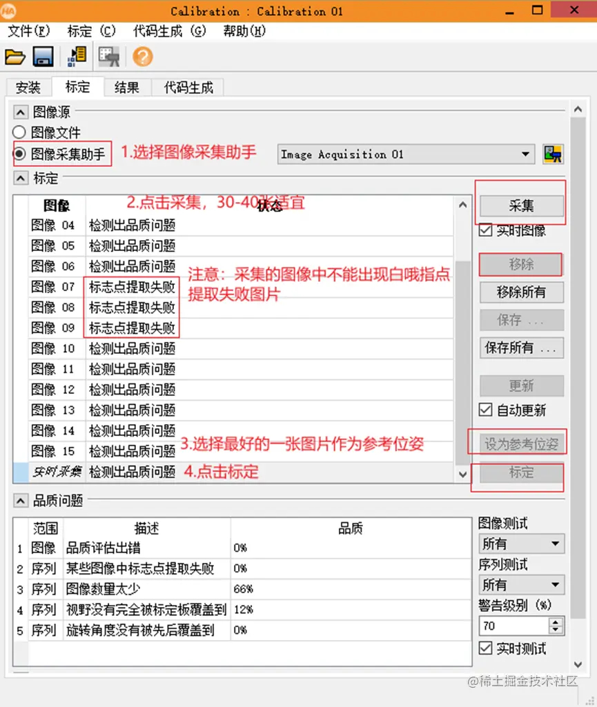 gen _caltab(行个数, 列个数, 圆形之间的间距单位M, 圆的半径与圆心间距之间的比值, 生成的文件名称caltab.descr', 'caltab.ps') 生成标定板的描述文件进行保存