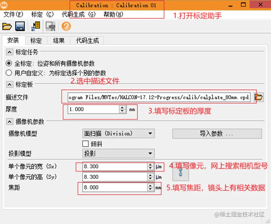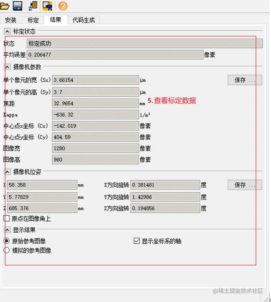 CameraParameters :=['area_scan_division',0.0329654,-636.32,3.66154e-006,3.7e-006,-142.019,404.59,1280,960] 外参