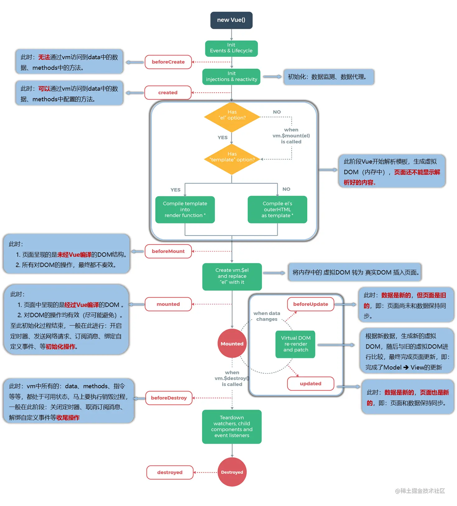 mounted:发送ajax请求、启动定时器、绑定自定义事件、订阅消息等初始化操作beforeDestroy:清除定时器、解绑自定义事件、取消订阅消息等收尾工作- 一般不会在