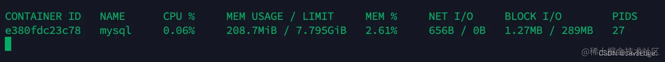 e380fdc23c78 mysql 0.05% 208.7MiB / 7.795GiB 2.61% 656B / 0B 1.27MB / 289MB 27