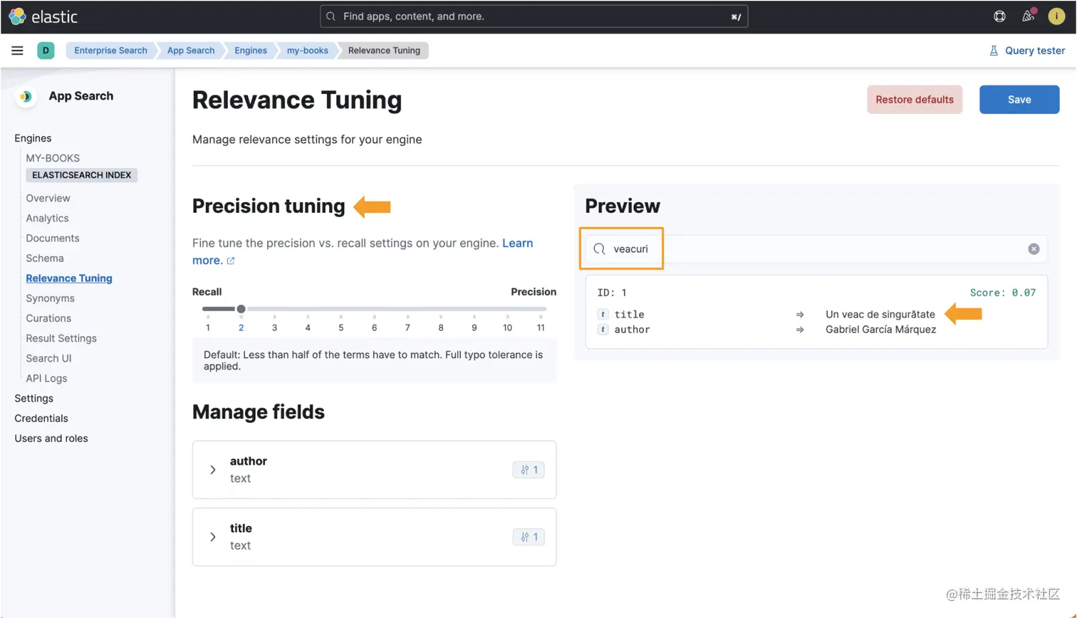 然而,在使用语言优化索引时,当我们搜索 veacuri 时,Elastic App Search 会将其与罗马尼亚语单词 veac 相匹配,并返回我们要查找的数据。 相关调整视图中也提供精确调整字段! 查看此图像中所有突出显示的位: