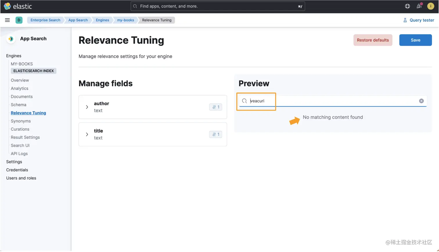 当你从现有 Elasticsearch 索引创建引擎时,如果映射不遵循 App Search 约定,则不会为该引擎启用所有功能。 让我们通过查看完全由 App Search 管理的引擎来更仔细地了解 App Search 映射约定。 该引擎有两个字段,title 和 author,并使用英语。