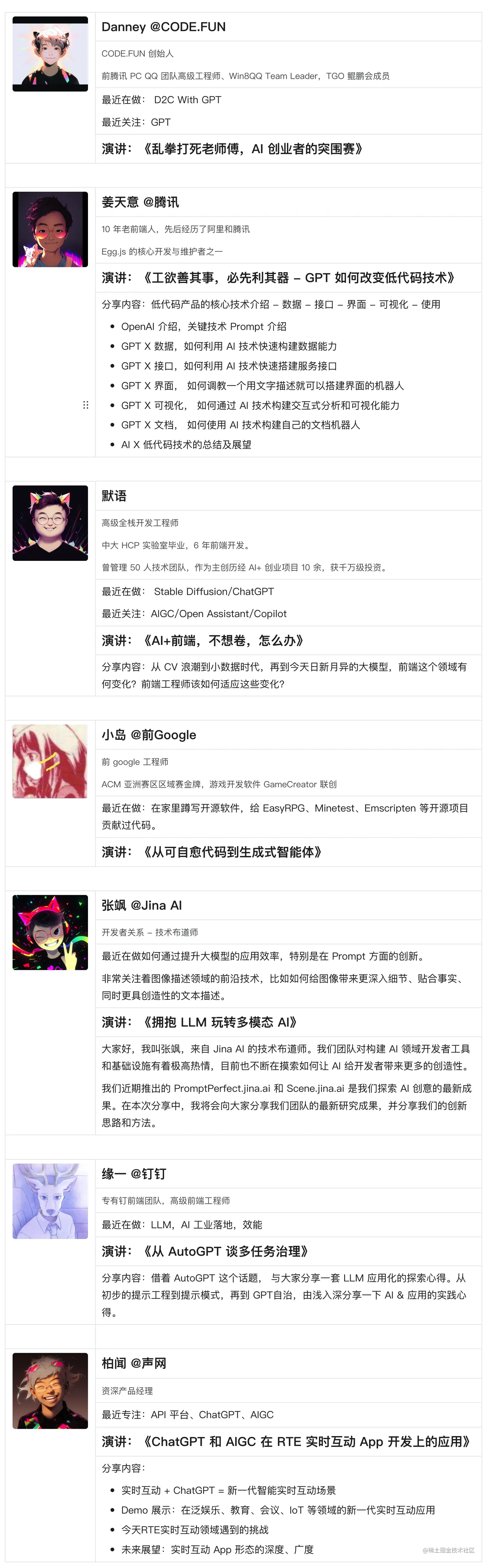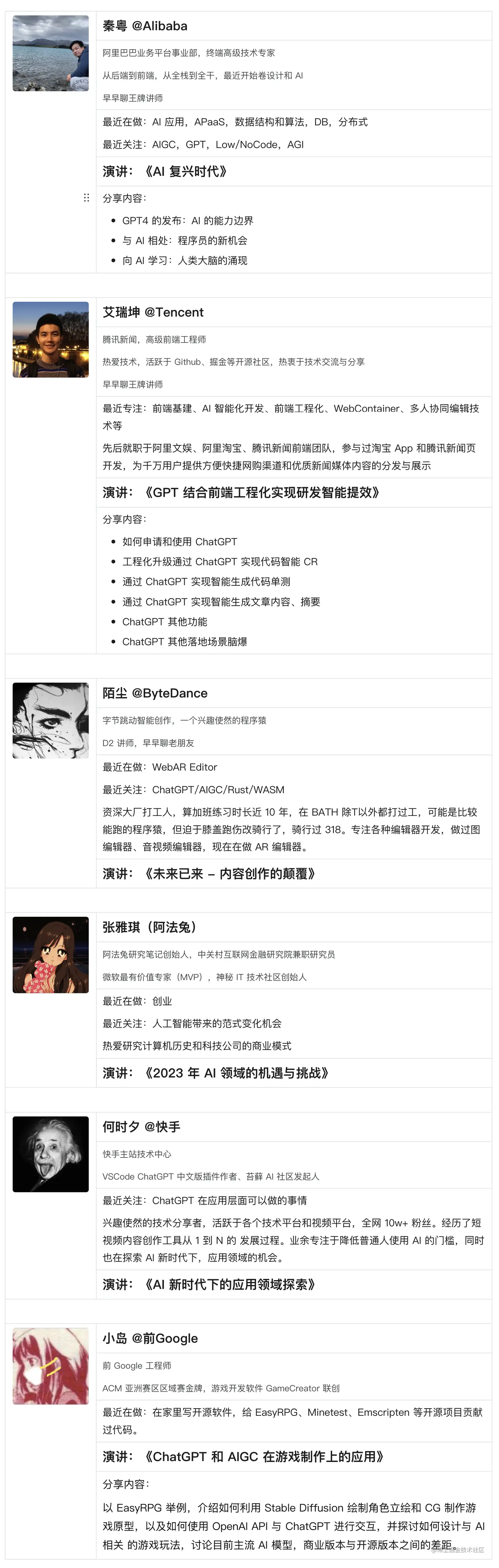 晚宴还有「早早聊 GPT ⼤咖酒蒙⼦」闭⻔鸡尾酒会!届时邀请早早聊历届王牌讲师,各公司 Leader、负责⼈与技术专家,整晚畅聊 GPT。