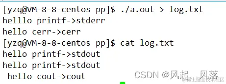 输出重定向是将标准输出重定向,此时log.txt文件中只会存在标准输出的内容 所以标准输出和标准错误都会向显示器打印,但是其实是不一样的