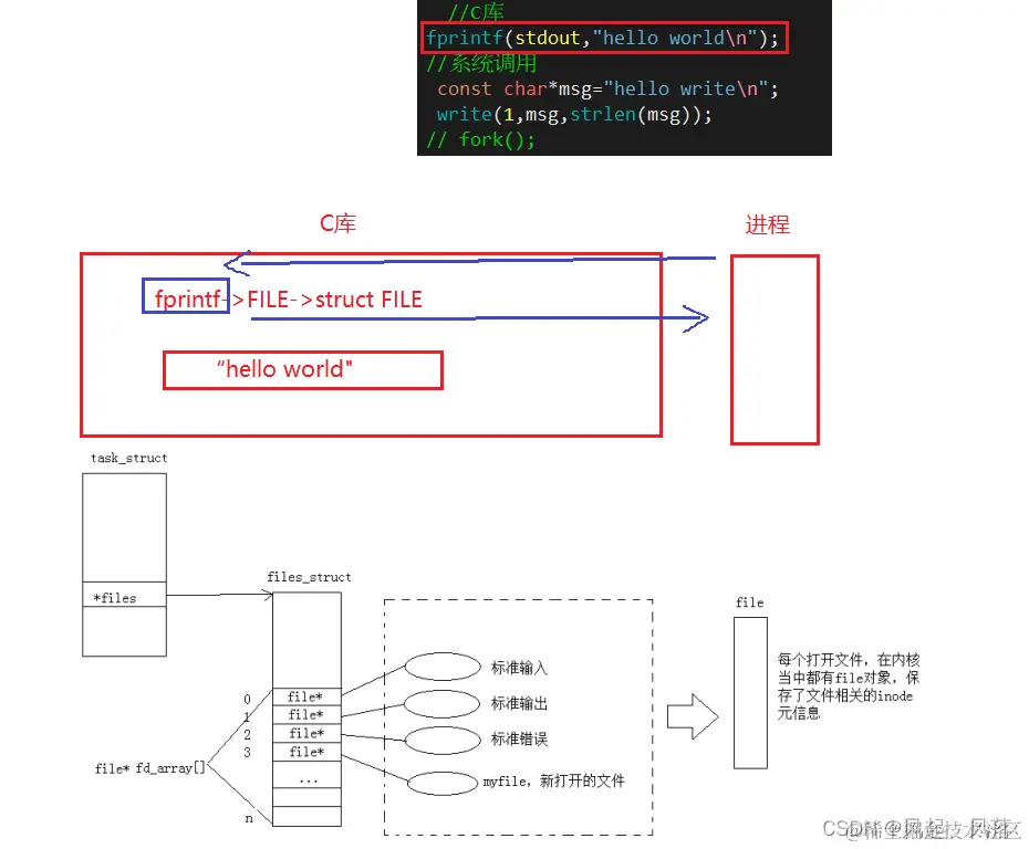 struct FILE除了会封装fd之外,还会预留一部分输出缓冲区 当把字符串想写入stdout中时 ,struct FILE除了fd,还有一部分缓冲区 当我们想写的时候,并不是把数据拷贝到操作系统内部,而是把数据放到缓冲区当中 此时这个fprintf函数会直接返回 C库会结合一定的刷新策略,将缓冲区中的数据写入操作系统(write(FILE->fd,xxxx))