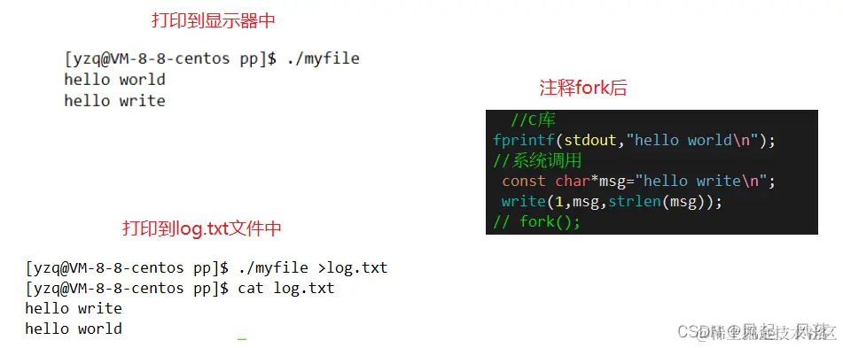 write接口不论有没有重定向,都会正常打印,因为调用write是系统调用 没有缓冲区,直接调用就写给操作系统了 而使用fprintf ,数据会先写入缓冲区 当要打印到显示器中时 刷新策略:行缓冲 因为打印的内容都存在\n,在调用fork时,打印的内容已经在缓冲区中被刷新走了,刷新之后在fork就没有任何意义了 所以fork就什么也没干