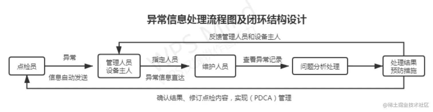 点检人员提交点检异常表单时,后台会实时推送异常信息到管理人员的手机上,管理人员审核后可直接指定该异常的处理人员,将信息同步给维护人员,维护人员可直接查看点检人员提交的异常状态,处理完成后反馈点检人员,实现闭环管理。