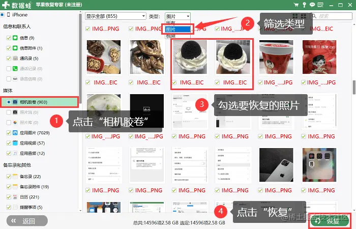 备注:想要更快速的筛选我们要恢复的数据类型,可以在【类型】那里选择【图片】。