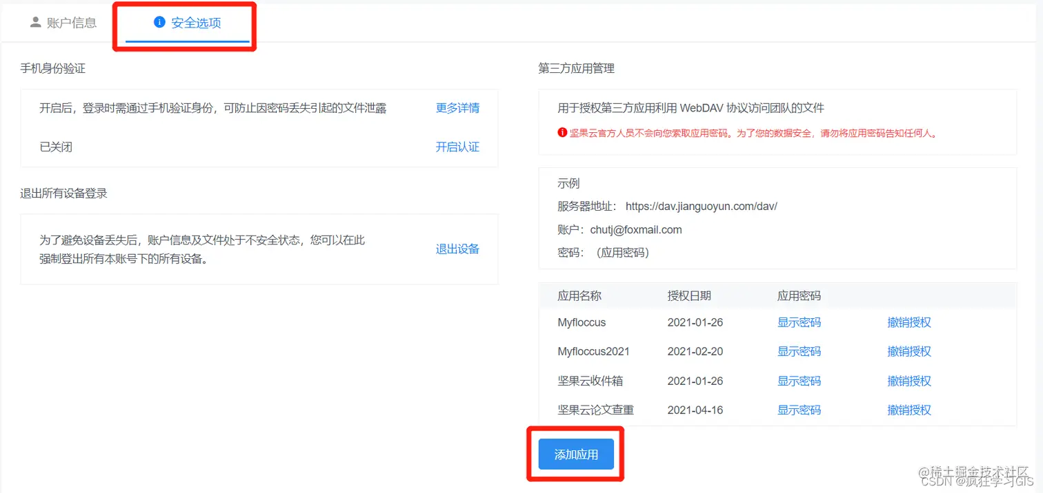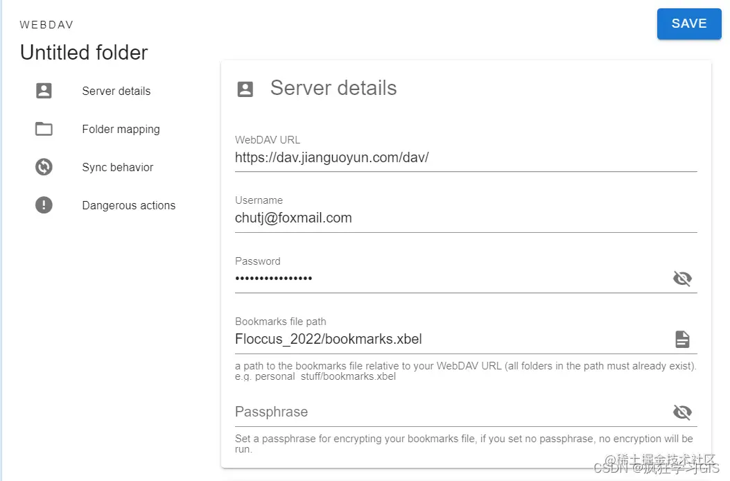 接下来,在弹出的窗口中(如下图所示),第一行与第二行分别按照前面我们提到的坚果云“第三方应用管理”处(如下下图所示)的“服务器地址”与“账户”输入即可,第三行密码输入我们坚果云前期生成的密码即可;第四行输入我们前期创建的bookmarks.xbel文件的路径;第五行密码可以设置也可以不设置,大家根据提示按照自己的需要来即可。