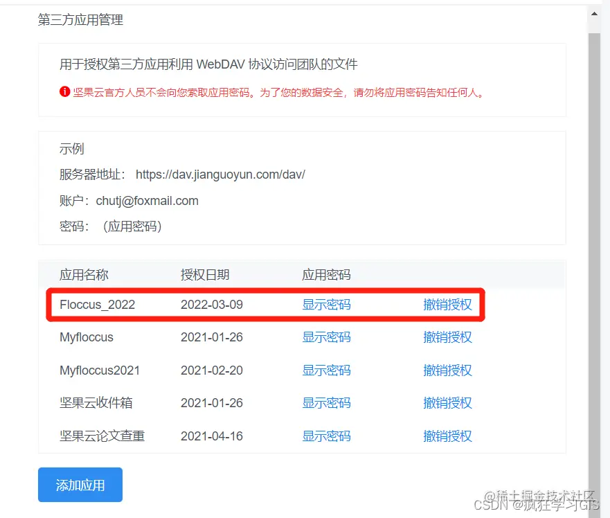 此时,即可在“第三方应用管理”处看到我们刚刚生成的应用名称与密码。