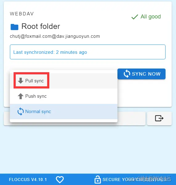 如果我今后需要在别的浏览器中同步我刚刚Chrome浏览器同步的书签,那么只需要在对应的新的浏览器中也安装floccus插件,且将我刚刚使用的账号导入进去,选择“Pull sync”,即可实现同步。