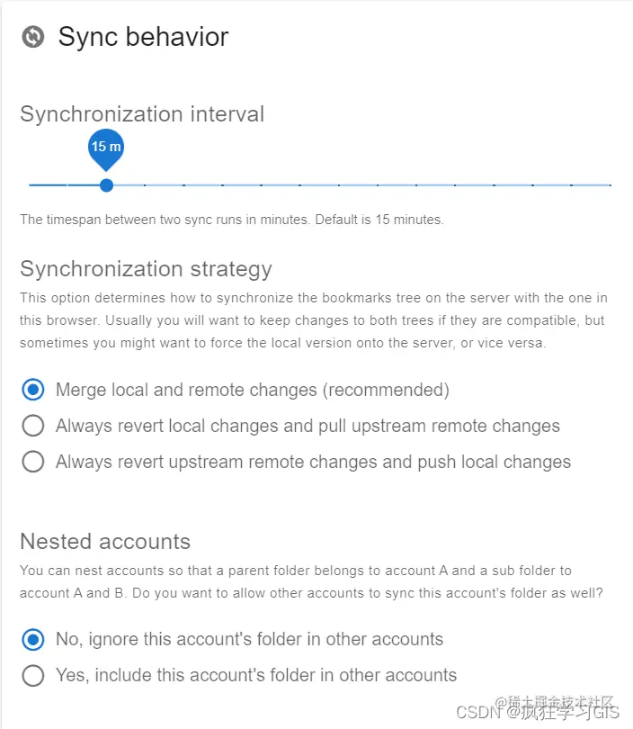 接下来,大家按照个人习惯,设定一下书签的同步频率。我这里选择了15m,就说明只要我开启Chrome浏览器,该插件就会每隔15分钟自动同步一次我们的书签。
