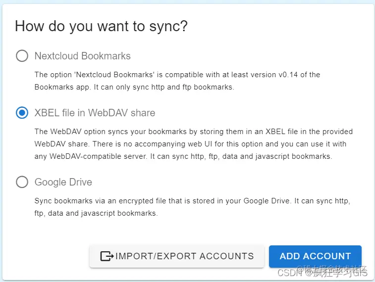 随后,点击“NEW ACCOUNT”,创建一个新的账户;在弹出的窗口中,选择“XBEL file in WebDAV share”选项,并点击“ADD ACCOUNT”。