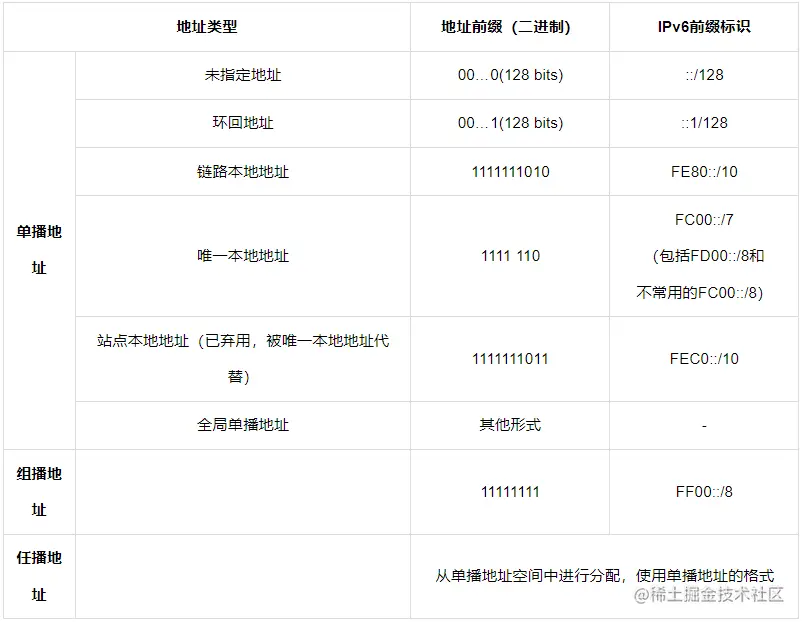 IPv6地址类型是由地址前缀部分来确定,主要地址类型与地址前缀的对应关系如下: