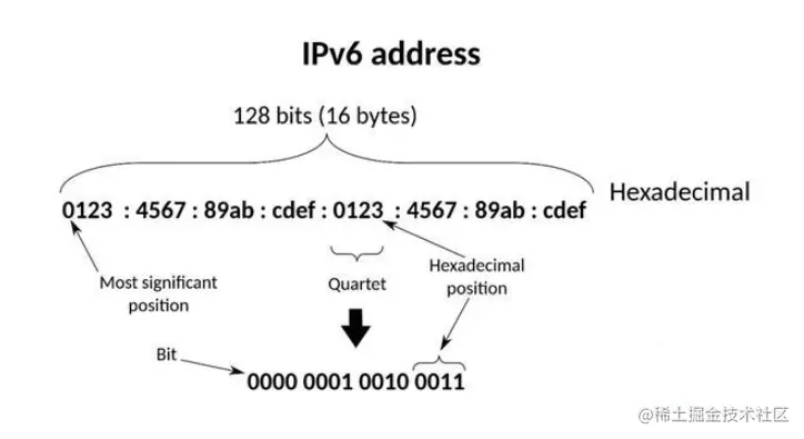 IPv6的地址长度为128位,是IPv4地址长度的4倍。一个IPv6的IP地址由8个地址节组成,每节包含16个地址位,总长度是16x8=128位。