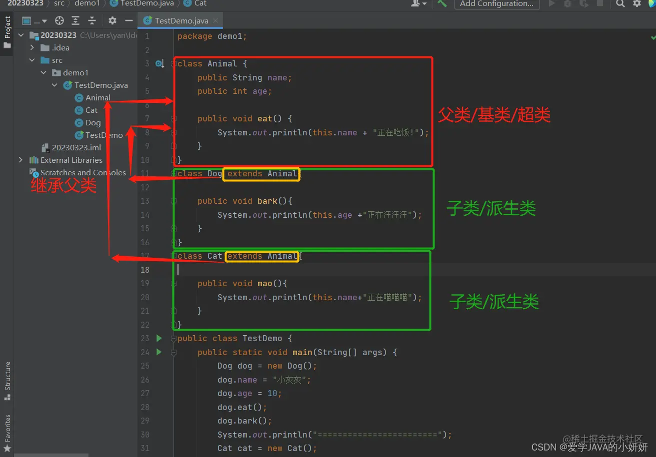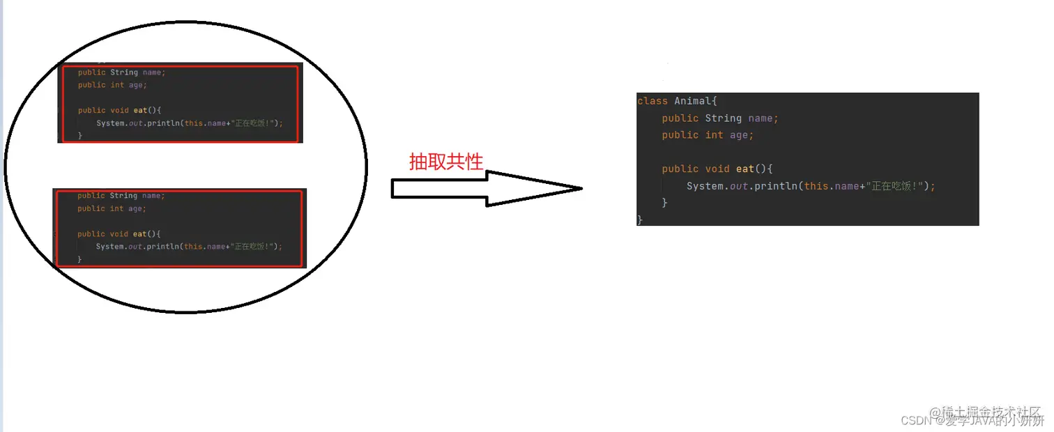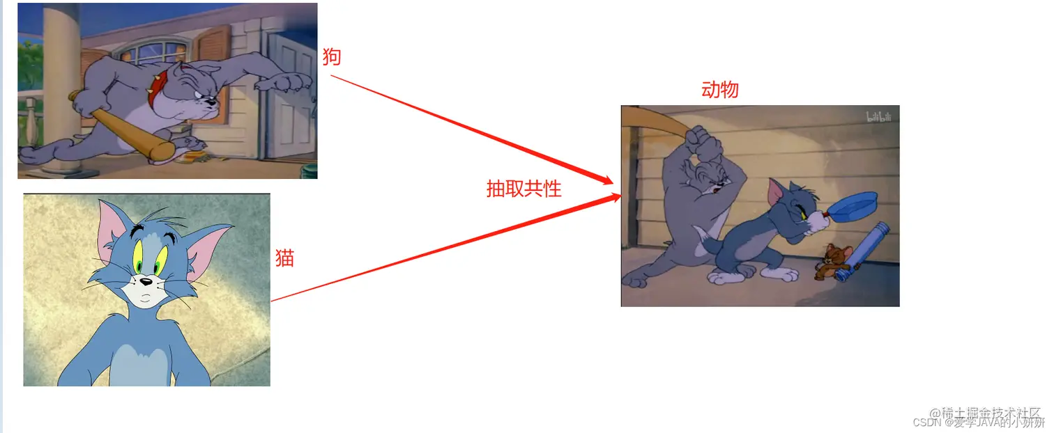 Java用继承将现实世界中多种多样的实体进行共性抽取,然后让实体继承共性,从而简化代码.比如,我们将猫和狗抽取出他们的共性—动物.