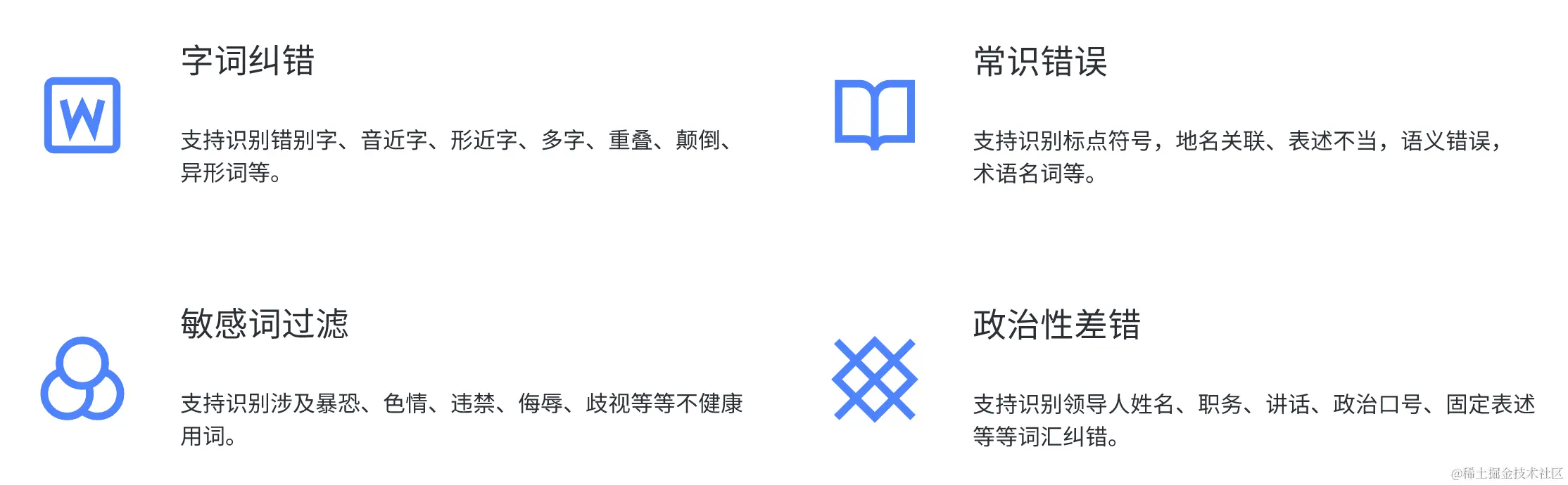 智能文本纠错技术是针对字词错误、标点、地名、专有名词、敏感信息、意识形态等进行智能校对,具体的纠错能力如下:
