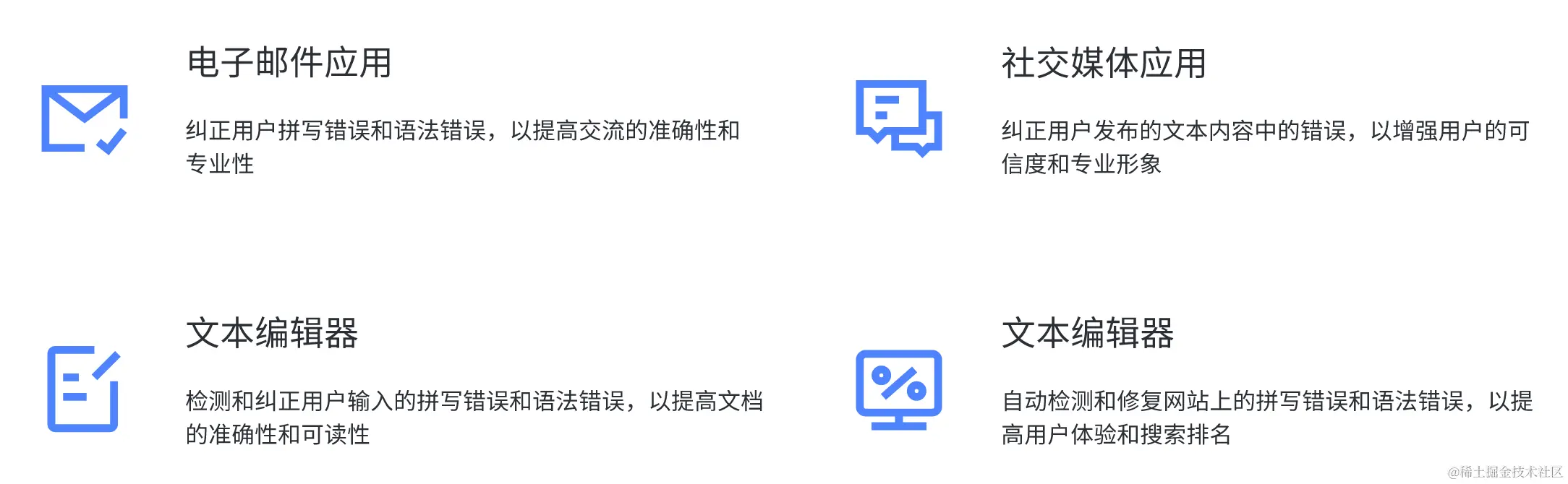 当前的基于机器学习的智能文本纠错 API 已经非常成熟,并且广泛应用于各种领域,例如写作工具、手机输入法和翻译软件等,下面是一些常见的应用场景: