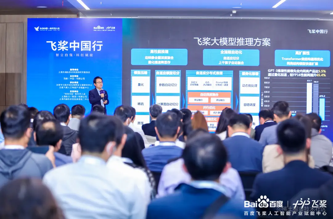 4月27日,百度“飞桨中国行”落地上海,围绕“如何运用深度学习平台+大模型技术打造壁垒快速破局”主题,飞桨携手区域企业、高校院所、硬件厂商、开发者等生态伙伴共话 AI 技术新动向和产业升级新趋势,助力上海夯实具有国际影响力的人工智能“新高地”,引领上海集成电路、生物制药、人工智能三大产业创新发展。