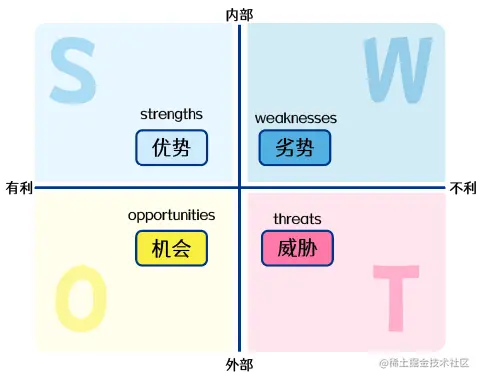 SWOT分析法,也称态势分析法或道斯矩阵。分别包含:内部要素的优势和劣势,外部要素的机会和威胁。