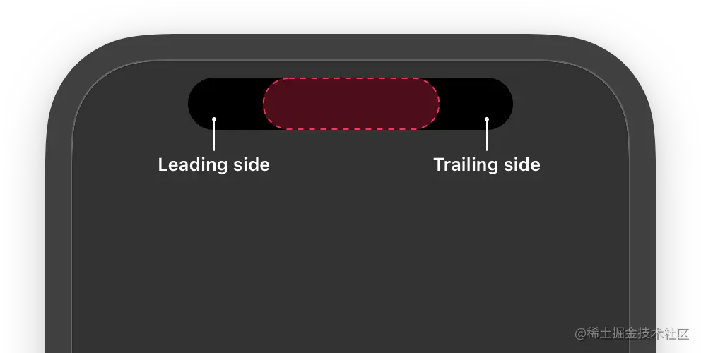 当系统只有 1 个实时活动的内容时,灵动岛默认使用紧凑模式。紧凑模式下UI由头部(Leading side)和尾部(Trailing side)组成,如图所示。用户可以点击灵动岛打开 App 查看实时活动的内容。