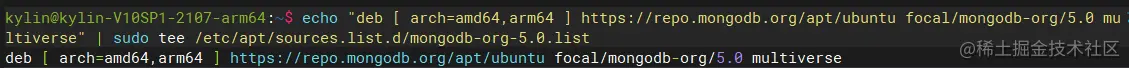 echo "deb [ arch=amd64,arm64 ] https://repo.mongodb.org/apt/ubuntu focal/mongodb-org/5.0 multiverse" | sudo tee /etc/apt/sources.list.d/mongodb-org-5.0.list