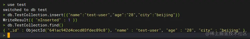 db.TestCollection.insert({"name":"test-user","age":"28","city":"beijing"}) # 插入一条数据
