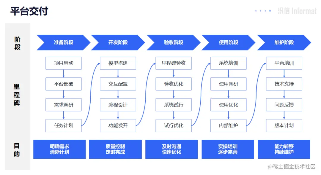 绝大多数企业在数字化转型初期,都会缺乏明确的数字化战略计划。为此,织信低代码提供了“咨询+IT”深度结合的交付服务,配备了专业的方案咨询专家与IT开发人员深入到企业去做数字化咨询+需求调研,并严格按照项目制模式进行运转,从需求调研、模型搭建、流程设计、功能开发、需求验收、系统试行、使用优化、平台培训、技术支持、版本升级等一系列实施流程,旨在帮助企业更清晰地实现数字化目标。