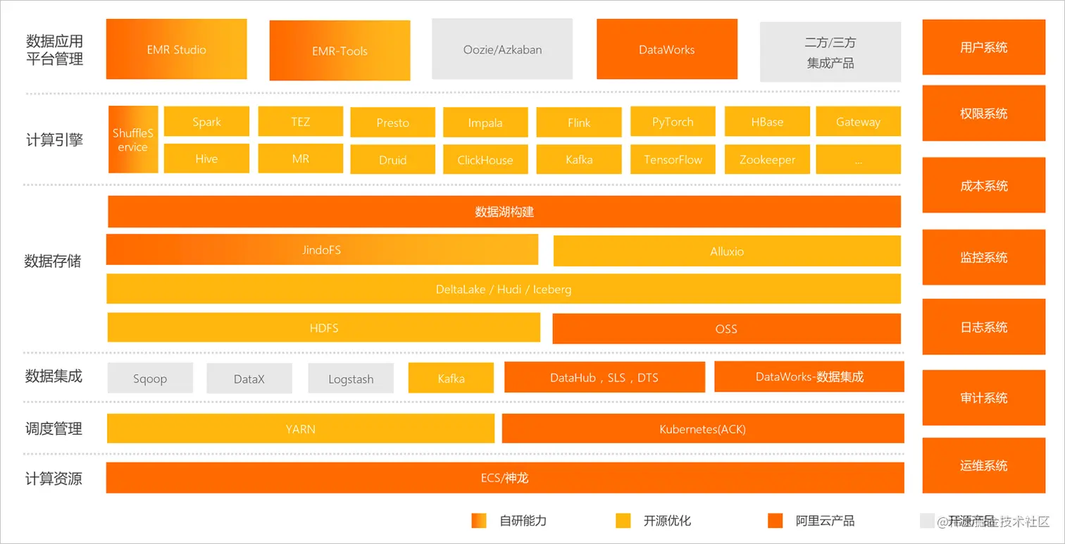 先上官方的两张的描述自己的EMR 架构图片, 我个人直观感受还是比较喜欢AWS 这种风格,描述的简单明了,同时实际上内部的功能并不别阿里云的少,只是并没有想通过一张图片就想全部展示出来。 阿里云的就是有点过于丰富了,想通过一张图片把所有的东西都展示出来,有点堆砌的感受。