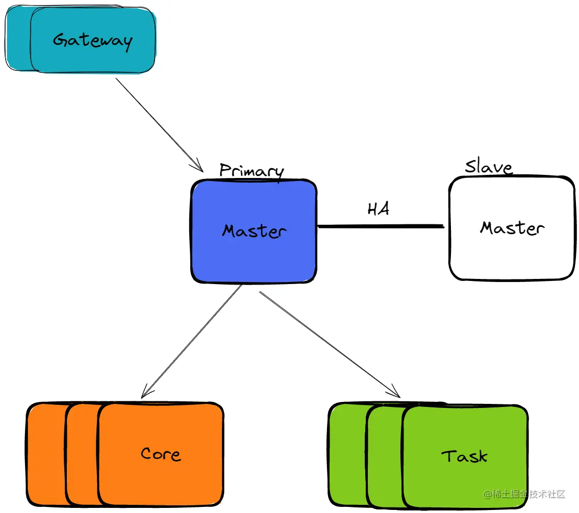 整体架构,阿里云和AWS云是相近的,都是分 Master -> Core -> Task 三种类型节点,阿里云特殊的包含一种叫做Gateway 的提交机,这个会单独讲下,然我们先看下各种类型节点的功能。