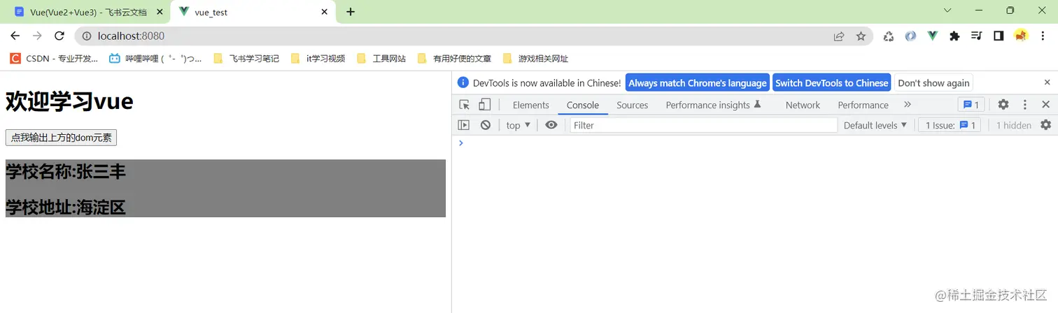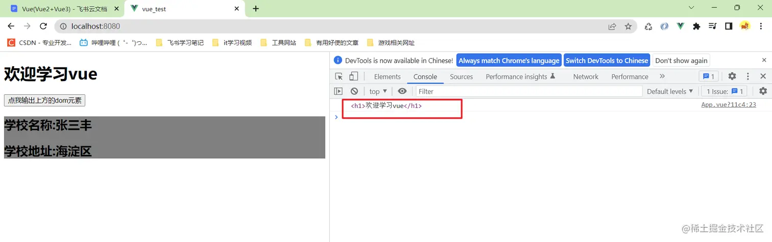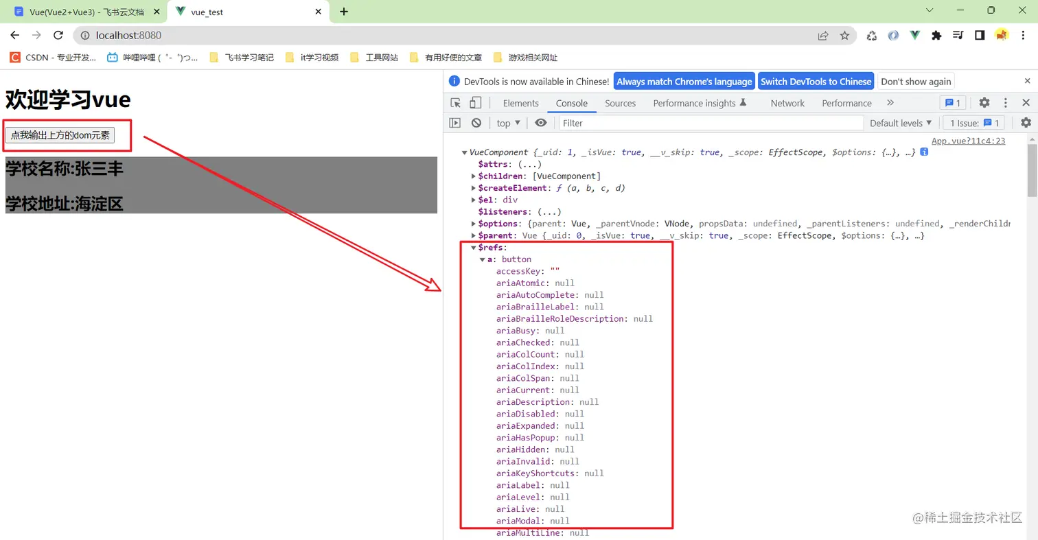 这里面我给h1标签一个ref属性,然后单击的时候输出vc,可以看到里面有一个$refs属性,里面就死定义的ref属性