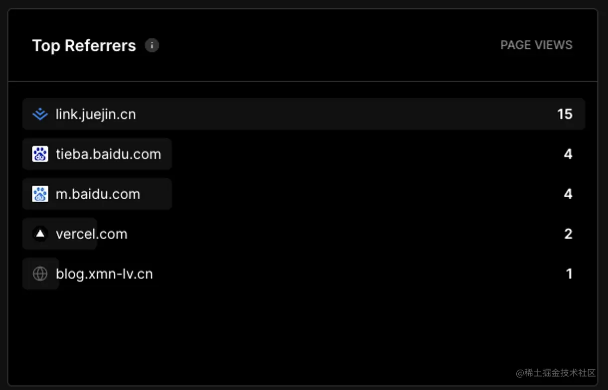 - 展示来源于哪些外部网站没,可以看到来源于掘金的数量最多,后续可以多发掘金文章哈哈