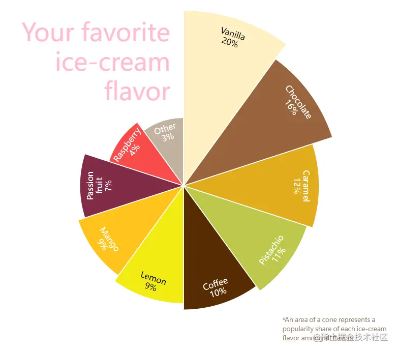 此图表在视觉上类似于饼图,但南丁格尔图无法传达部分到整体的关系。它像条形图一样比较类别之间的值,只有这个是径向的。