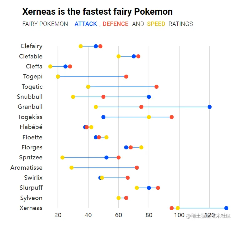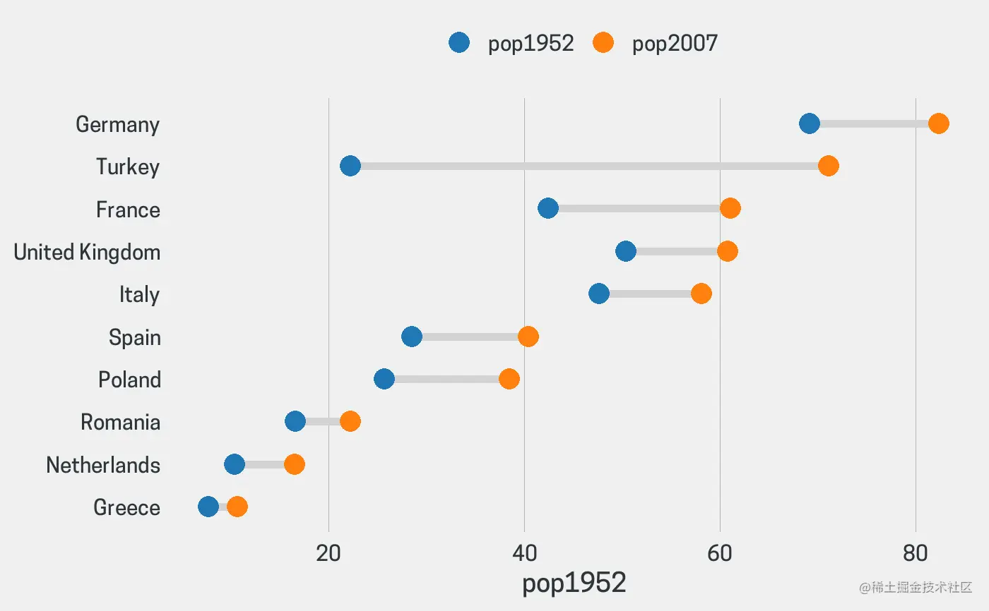 哑铃图是一种点图,每个类别有两个连接的值。当您想要强调两个值(数据点,即两个时间点)之间的增量(变化)并比较和可视化所有类别中这两个值之间的差异时,请使用它。哑铃由点(或圆圈)和连接线(或线)组成。不添加标记,只留下连接线,使其成为范围图。我们在整篇文章中都提到了哑铃。
