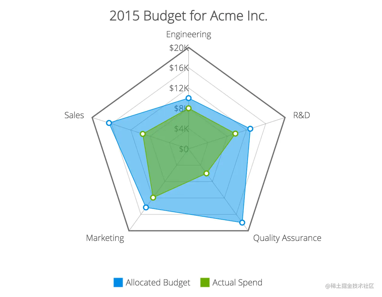 雷达图显示多个数据点或组之间的比较(至少三个)。它由几个轴组成,所有轴都来自中心的同一点(类似于蜘蛛网)。虽然这是一个非常有趣的图表,但重要的是要记住它更难阅读。由于它是以圆形方式设计的,因此与更常见的线性图表和图形类型相比,它需要额外的视觉感知。用另一种类型的图表替换它通常更容易。如果图表中的所有轴具有相同的比例,则条形图或有时棒棒糖就足够了。如果轴具有不同的比例,则最好使用平行坐标。