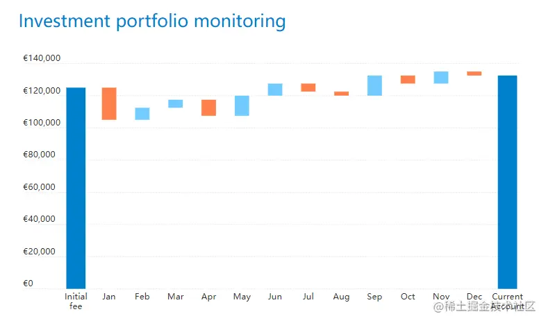 瀑布图是一种图表,通常显示两点之间变化的正值和负值,这有助于了解这些变化的累积效应(即净变化)。此图表不仅查看数据集的起始值和结束值,还可视化发生的每个单独的正或负变化。可以想象,这种类型的图表在金融部门或人力资源中非常有用,但在其他行业(想想库存、收入跟踪等)也非常有用。最后但并非最不重要的一点是,瀑布图的名字来自它看起来像瀑布的事实。在图表中,第一个值(列)通常从基线零开始,结束值也是如此。它们由许多看似浮动的较短条(代表上述变化)连接。图表的整个形状类似于瀑布。