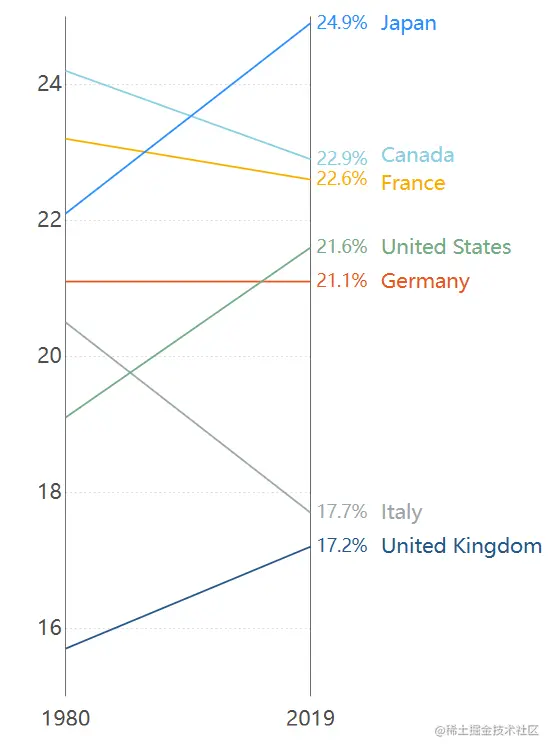 斜率图是通过使用斜率的角度来传达差异来强调两个值之间的演变的图表。它可以是随时间的变化,也可以是过渡。如果我们只有两个时间点要解决,则斜率图可能是折线图、分组条形图或堆积条形图的良好替代方案。