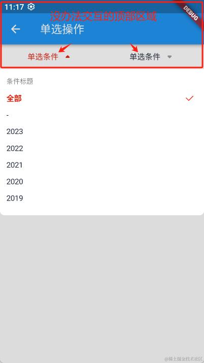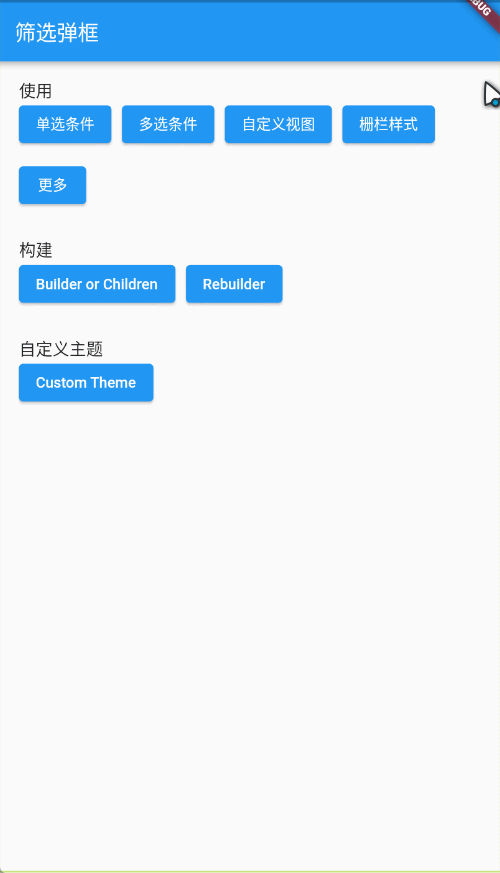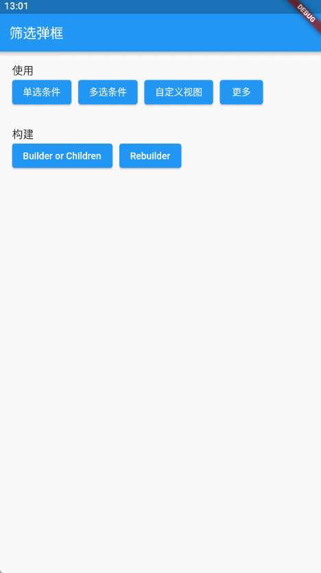 组件的创建有两种方式:rebuilder、builder和默认构建方法,区别就是rebuilder每次显示弹框视图都会重新创建一次,所以修改了数据源后,每次打开都是有选中记录。而后两者则需要自己去动态刷新对应的弹框视图 SpinnerFilter。前一种使用简单,适用于绝大多数情况都适用,不用额外去刷新对应弹窗视图。