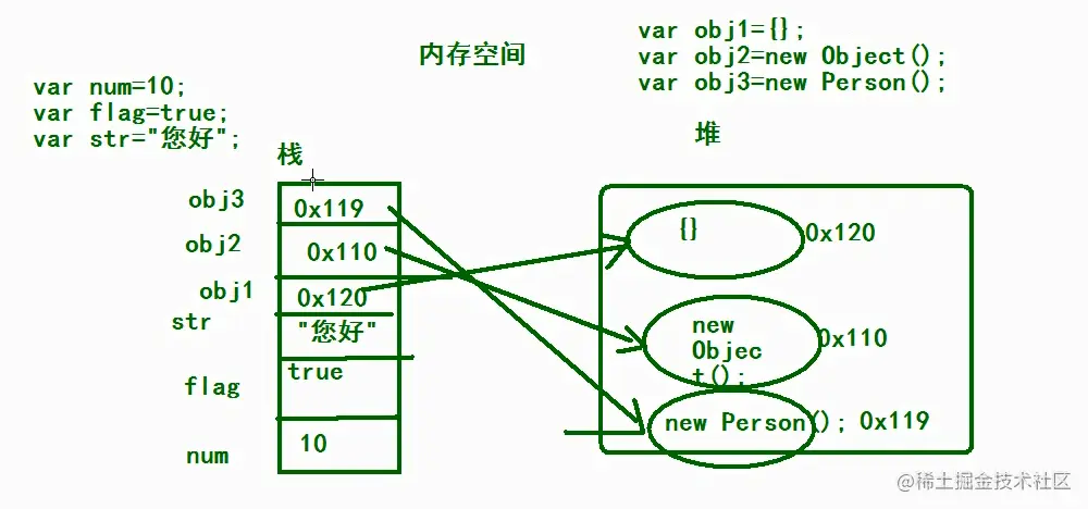 如上图所示,基本值类型:Number类型num=10;、Boolean类型flag=true;、String类型str="您好";值都是直接存储在栈上的;引用类型的值,内容都是在堆中开辟空间存储的,而变量obj1、obj2、obj3中存储的是指向堆中对象的地址。