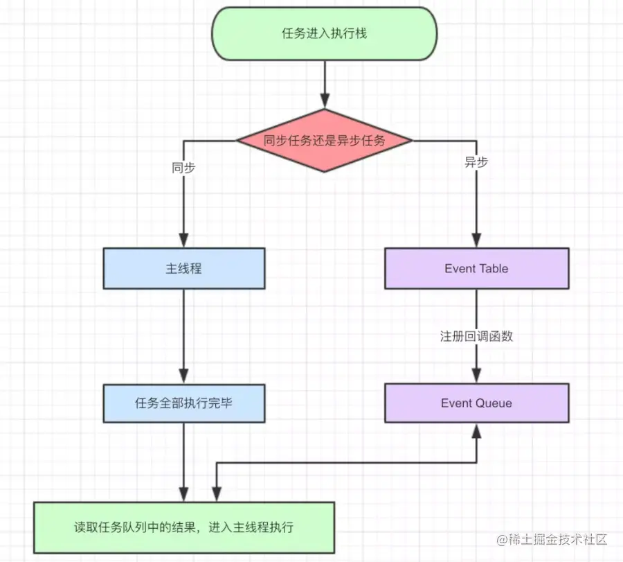 - 同步和异步任务分别进入不同的执行”场所” ,同步的进入主线程,异步的进入Event Table并注册函数。