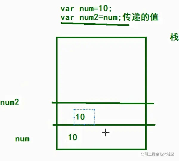 如上图所示,num和num2的值都是存储在栈上面的,执行num2=num;这行代码的时候,实际上是将num中的值创建一个副本赋值给了num2。