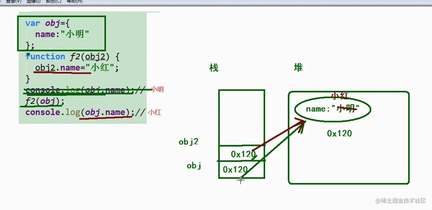 如上图所示,创建p的时候,是在堆中开辟一个空间存储数据内容,p中存储的是指向{"zs",18,1000}内容的地址,所以第一次输出的时候通过地址找到了p.name的值为 ” zs “ 。调用函数 f1 之后,p将地址传入f1 函数,person.name=”ls“改变了堆中name属性的值,所以第二次输出p.name的值为 “ ls “ 。person.new Person("aa",18,10)语句的执行,是重新开辟了一个空间存储{"aa",18,10},person中的值是指向这个内容的地址,没有改变p中的地址指向。