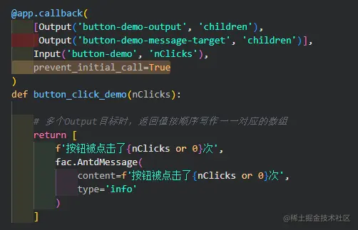 假如我们现在需要在页面中放置一个按钮,并在用户每次点击按钮后,在按钮旁边展示其累计被点击的次数信息,回调函数就可以写作(常规的回调函数本质上是在用@app.callback()对定义回调逻辑的函数进行装饰):