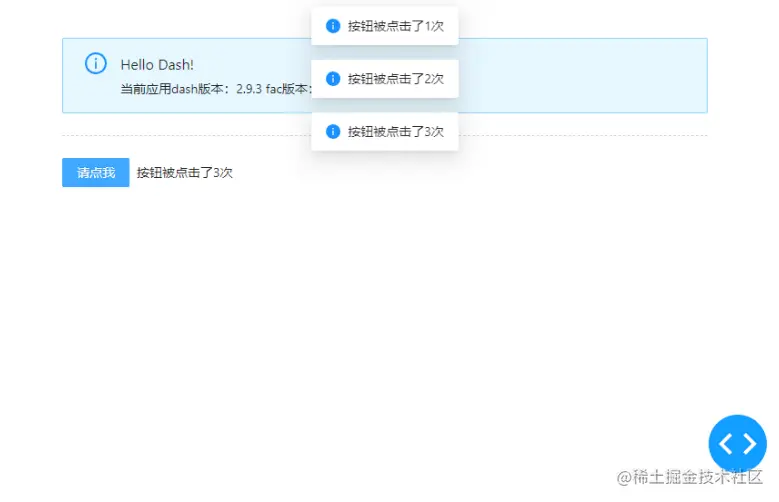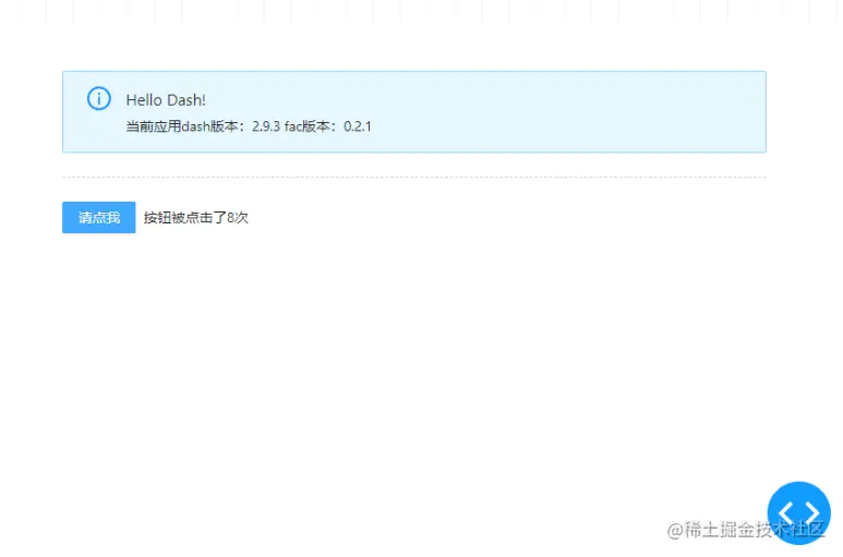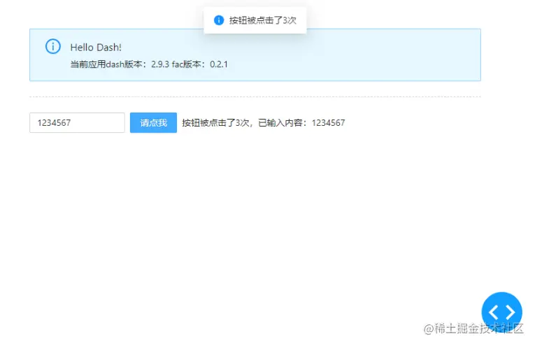 其中@app.callback()中编排的内容翻译成人话就是id为button-demo的组件的nClicks属性每次更新时,都会经过函数体内定义的逻辑将返回值更新到id为button-demo-output的组件的children属性,于是乎便实现了下面动图展示的效果: