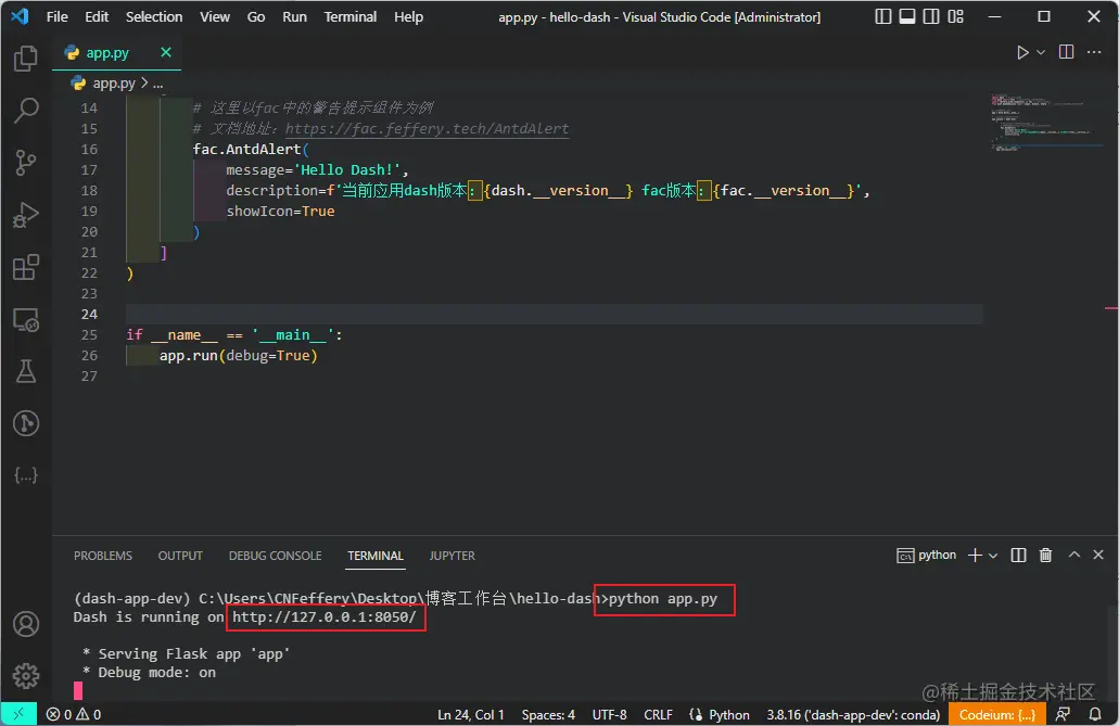 完成了上述过程后,我们先来启动一下当前的应用,在app.py末尾添加下列代码,其中debug=True用于启用开发调试模式,这是我们在dash应用开发阶段的好帮手,可以帮我们实现热重载、错误信息提示等便捷功能: